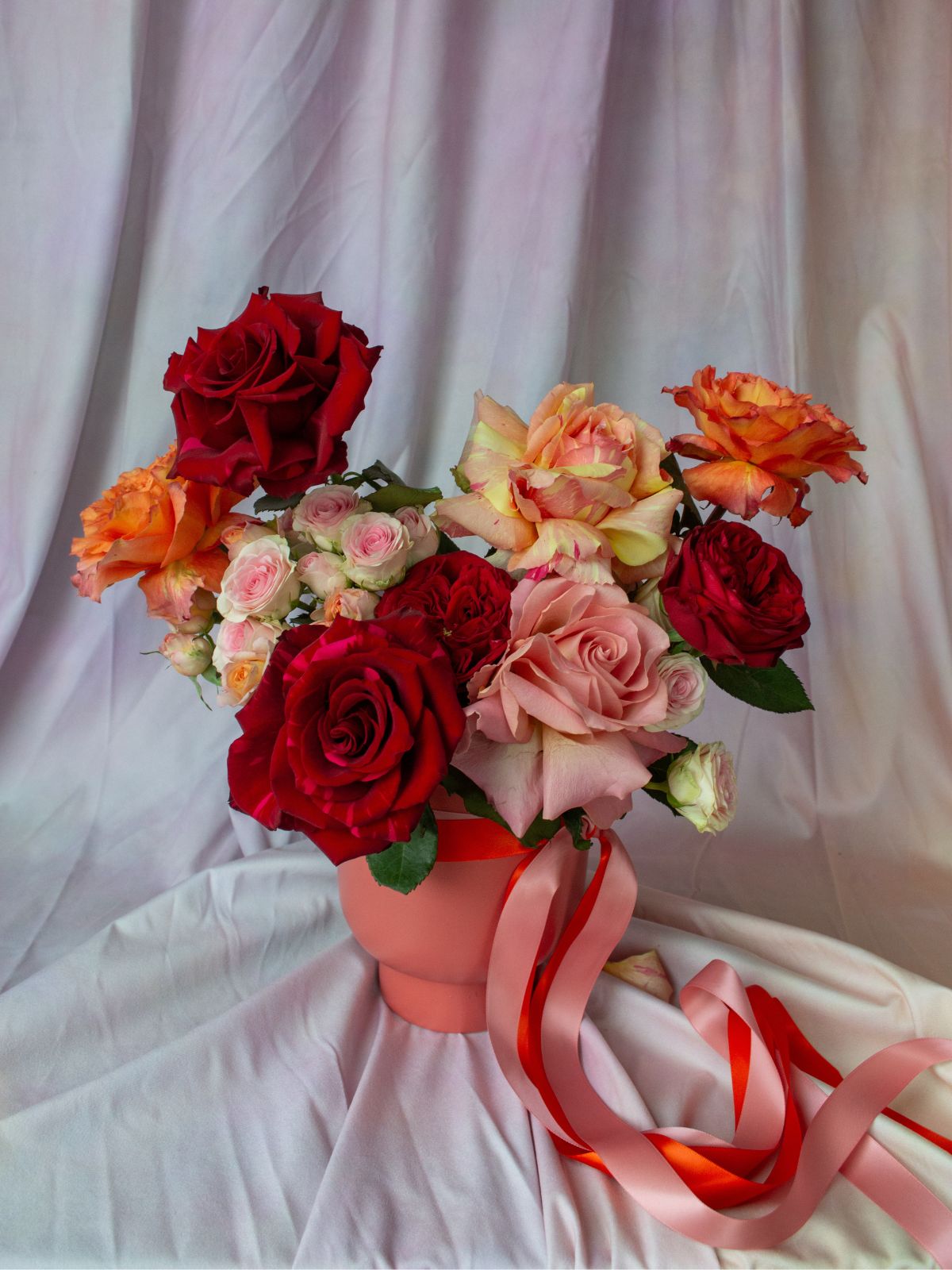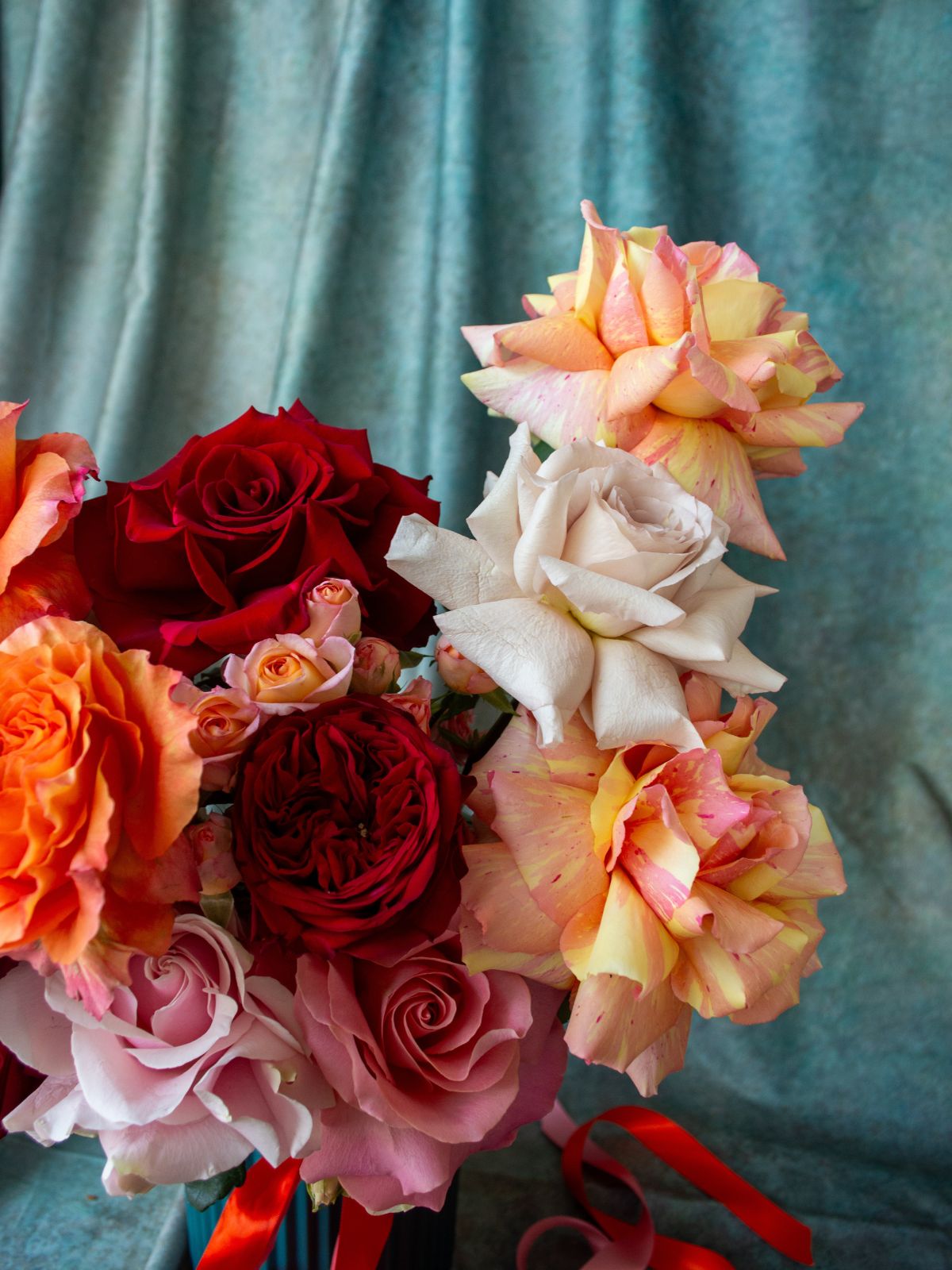 A celebration of the beautiful Rose. A bouquet of mixed coloured, deluxe roses, reflexed to get that ‘Wow’ effect.